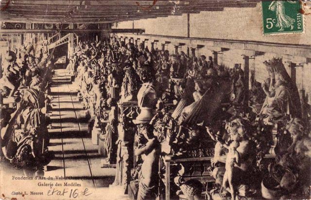 The foundries were working with many important artists such as Albert Ernest Carrier-Belleuse, Mathurin Moreau (shareholder in the company) or James Pradier. The Val d'Osne became famous for its monumental fountains, animal groups, statues and large groups of cast iron, after antique or classic models. Some old Wallace fountains in Paris are still stamped with the Val d'Osne signature. They also built some memorials after the First World War.