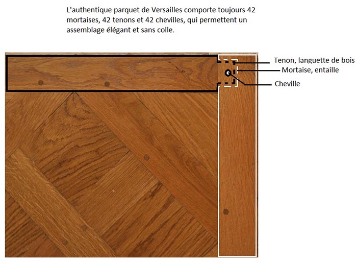 Named “French style parquet” (“parquet à la Française”) in 17th and 18th centuries, sometimes “thumbed compartment parquet” (“parquet à compartiments à l’onglet”), the parquet de Versailles is distinguishable by its square panels (composing the entire parquet), always counting 42 mortices, 42 tenons, and 42 dowels, hand assembled with no glue, and waxed. The dowel fixing mounts and tenons guarantee the authenticity of the fabrication procedure. Most of the time in plain oak, this parquet is generally posed in diagonal in function of the room, but the original rule is to arrange it starting from the fireplace.