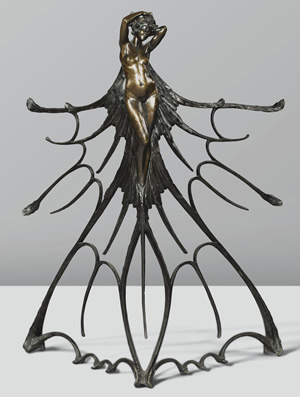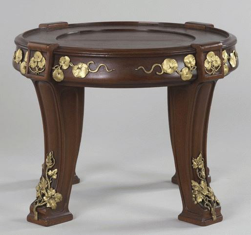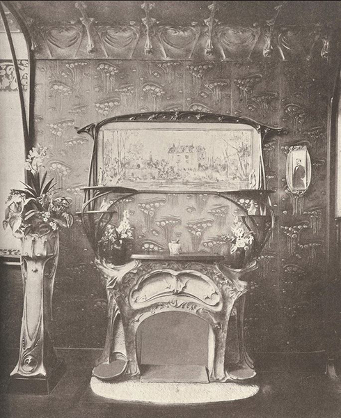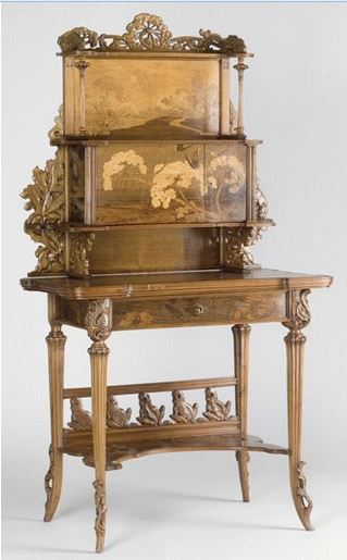 Art Nouveau triumphs, including the "Art Nouveau" pavilion by Siegfried Bing, decorated by De Feure. It exhibits interior decorations by Eugène Gaillard, Edward Colonna and Georges De Feure. Thus, in the field of furniture, Louis Majorelle acquires an international reputation, while Emile Gallé is consecrated by two great prizes and a gold medal. The Pérol Frères house also exhibits refine-lined designs. At François Linke’s stand, master of the Louis XV style and neo-rococo style, we also see extraordinary pieces, where the new style brings to a new dimension the fantasies of the eighteenth century.
