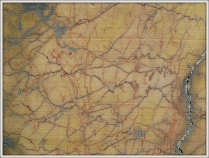 It is a limestone of yellow color with red or purple veins, not really a marble but rather a marble stone.